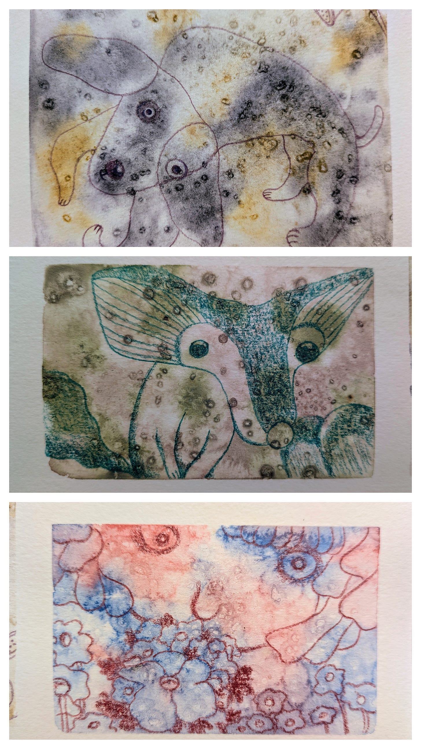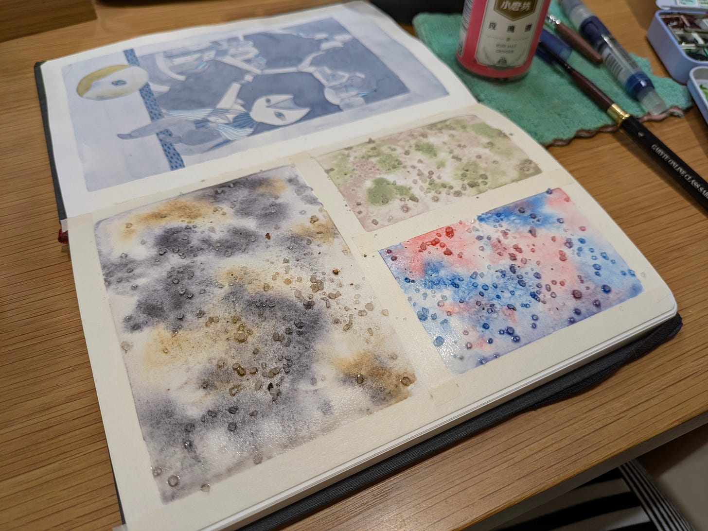另外使用鹽粒在水彩上做效果,再利用這些斑駁痕跡來塗鴉,也是很棒的放鬆練習。如果在創作時能感覺到好玩有趣,想嚐試媒材混搭的各種方式,可以接受結果嗎?是驚喜還是驚嚇?超乎想像當然很棒,結果不如預期你會如何想?是否會放過自己呢?