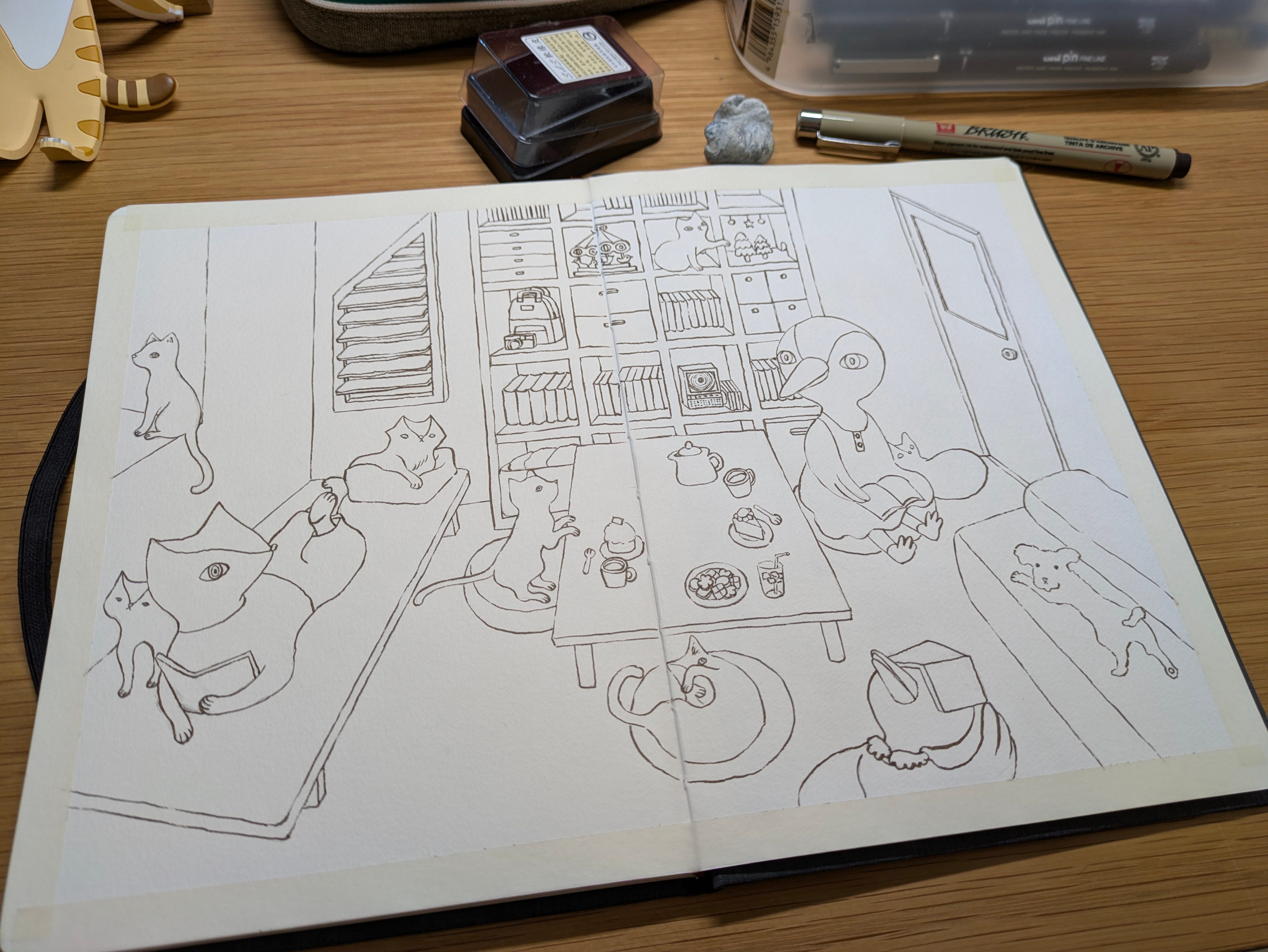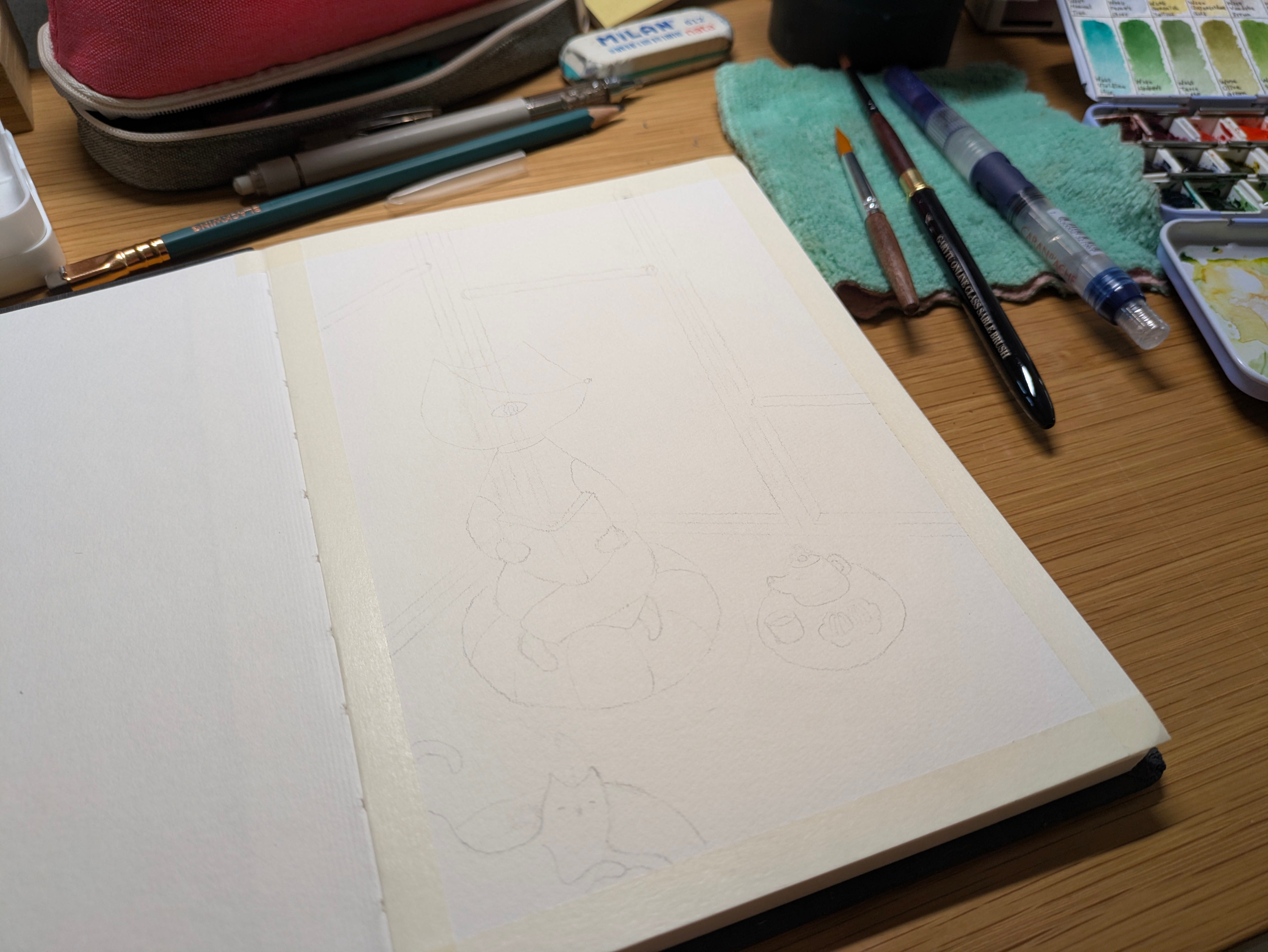 大約在下半年左右,因為和畫畫班的同學一起辦聯展,以及比較常跟好友們畫聚的關係,再加上有看到其他創作者有玩過類似的,因此想和畫友們玩一個傳遞寄送包裹的想法漸漸浮現,跟我的巫師好朋友Ola聊過後,11月我們開始準備畫畫包的內容、媒材和畫本,也秘密的邀請創作者朋友們,最後竟然有10位想要一起玩~