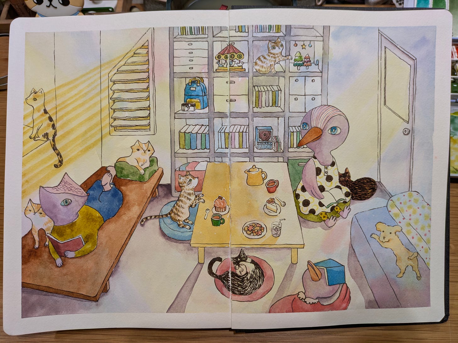 左半邊是我的新房間,右半邊是童年好友的房間,ㄧ邊是未來一邊是過去,可以完美的結合,我們依然是開心的聊天、吃點心、看書,和我們的貓貓狗狗在一起。